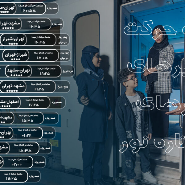 قطار نور به عنوان مدرن ترین قطار حال حاضر کشور به همراه کادر مهمانداری مجرب و باتجربه، پذیرایی شایسته را از مهمانان گرامی بعمل می آورند تا تجربه ی یک سفر دل نشین و بدون دغدغه را برای شما عزیزان به ارمغان بیاورند.