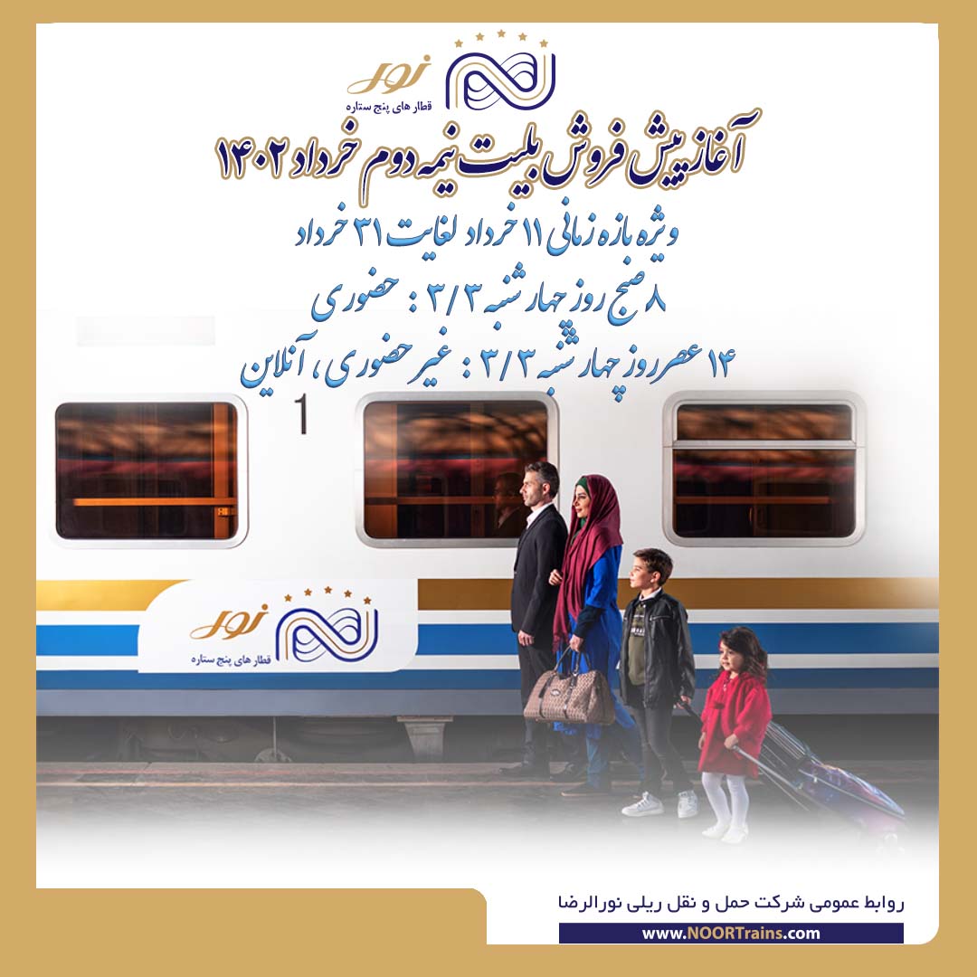 پیش فروش نیمه دوم خرداد ۱۴۰۲ بلیت قطارهای پنج ستاره نور آغاز می گردد.