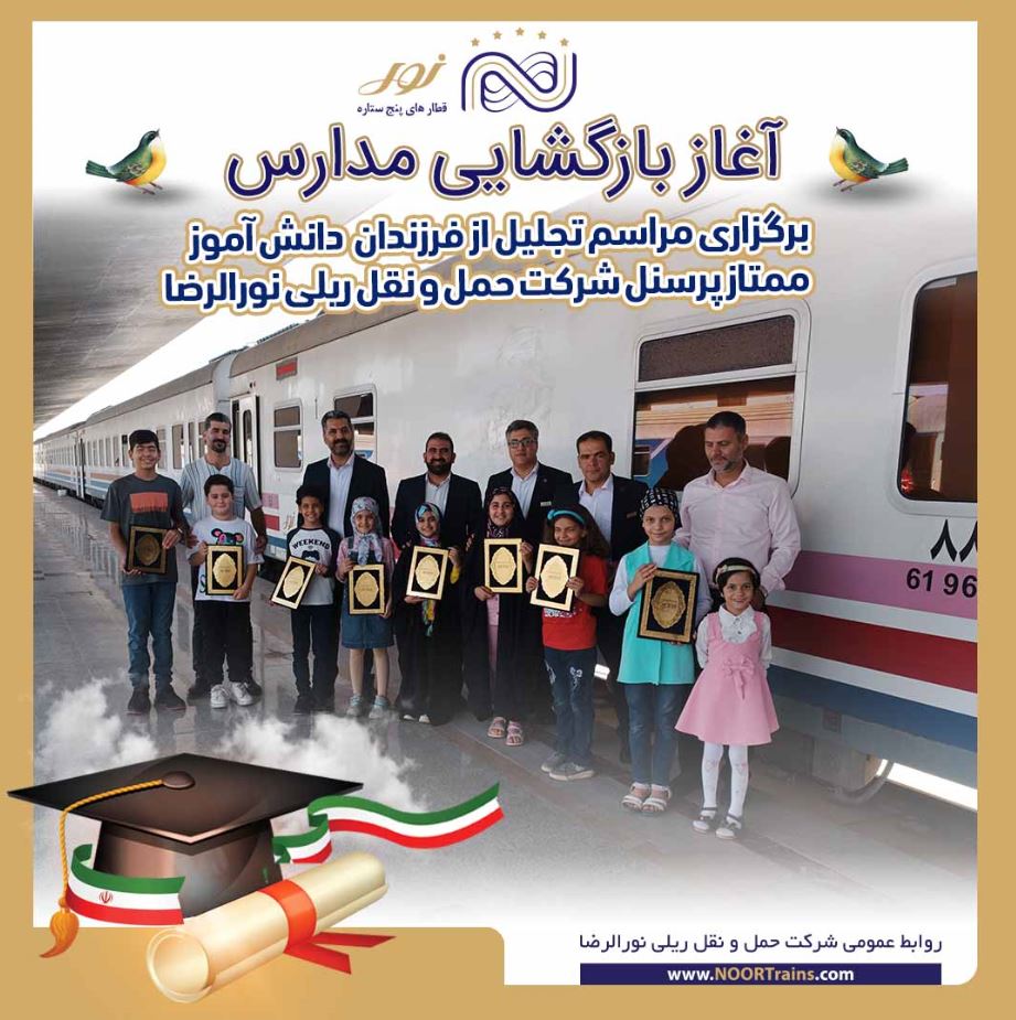به گزارش روابط عمومی شرکت حمل و نقل ریلی نورالرضا، مراسم تجلیل از فرزندان دانش آموز ممتاز همکاران شرکت حمل و نقل ریلی نورالرضا با حضور مدیران ارشد شرکت و جمعی از پرسنل این مجموعه و خانواده دانش آموزان،در جهت تکریم همکاران روز سه شنبه مورخه ۲۸ شهریور ماه ۱۴۰۲ در تهران و نواحی برگزار شد.