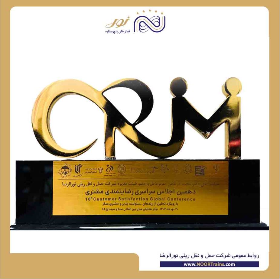 گفتنی است این مراسم که با محوریت شناخت و بررسی چالش های کسب و کار و بررسی شاخص های ۱۷ گانه ، که مهمترین آن مشتری مداری است برگزار می شود؛ و با توجه به عملکرد قطارهای پنج ستاره نور در پیک نوروزی ۲سال گذشته و سایر اقدامات توسعه ای از منظر کیفیت ، حائز شرایط اعطای تندیس زرین مشتری مداری (CRM) گردید.