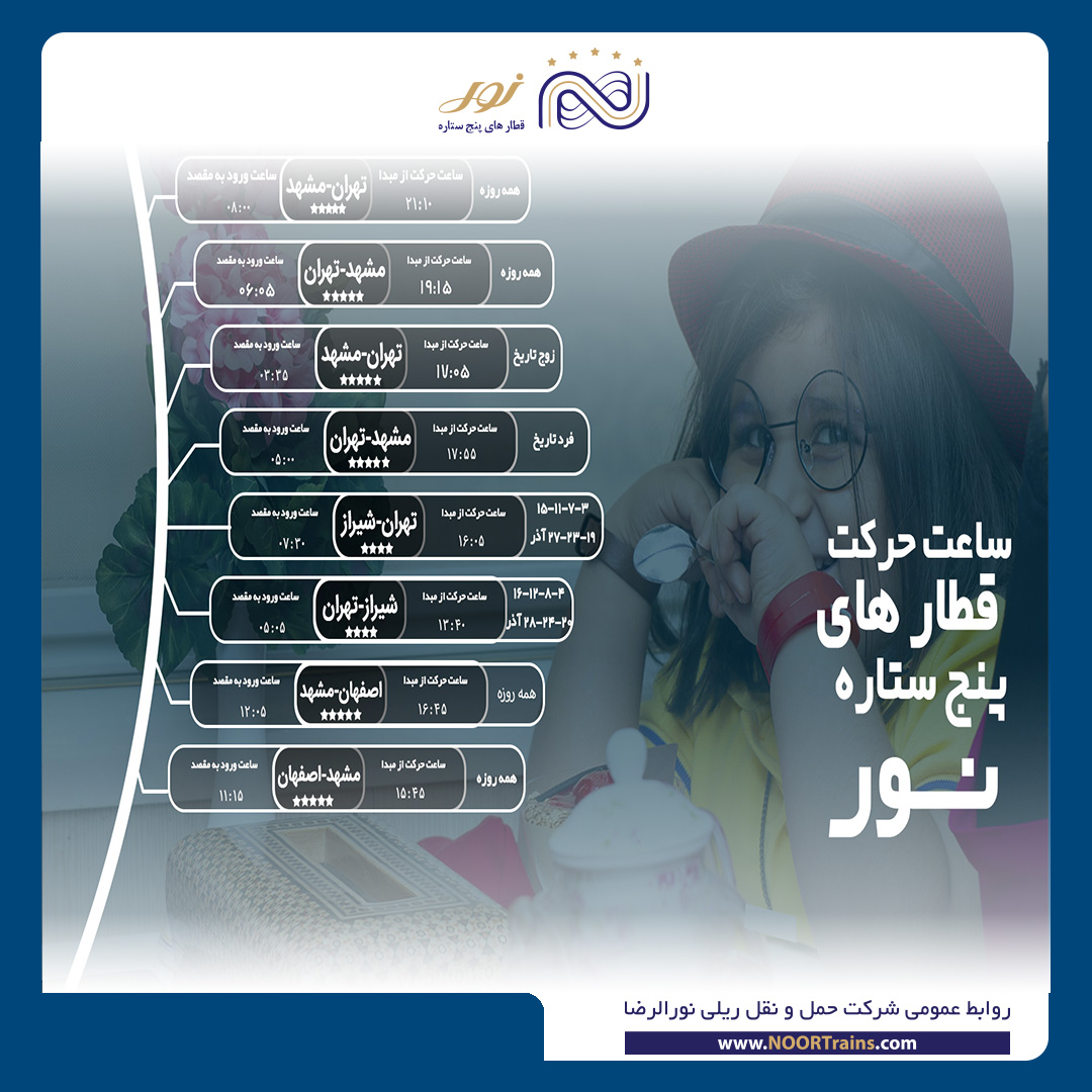 به گزارش روابط عمومی شرکت حمل و نقل ریلی نورالرضا، ساعت جدید مسیر های تهران-مشهد و بالعکس، تهران-شیراز و بالعکس، اصفهان-مشهد و بالعکس شرکت نورالرضا به شرح تصویر ذیل می باشد.