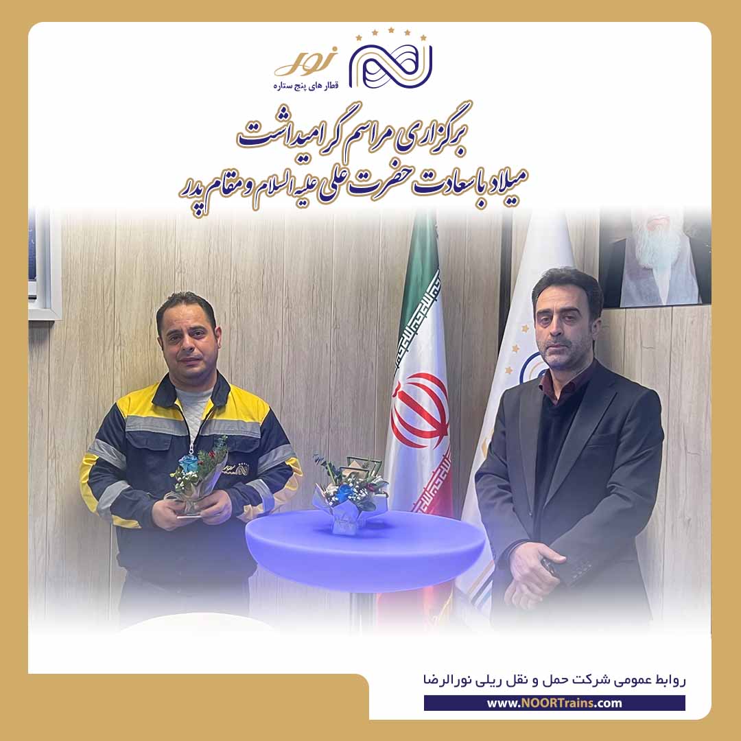 به گزارش روابط عمومی شرکت حمل و نقل ریلی نورالرضا، به مناسبت زادروز با سعادت حضرت علی(علیه السلام) و روز گرامیداشت مقام پدر طی مراسمی در شرکت نورالرضا از همکاران آقا تجلیل شد.