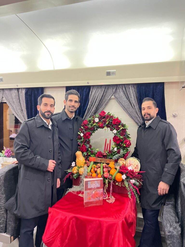 مهمانداران قطار پنج ستاره نور با حضور صمیمانه در کنار مسافران، تلاش کردند تا در بلندترین شب سال، بهترین خاطره ممکن از سفر را برای مسافران عزیز رقم زده و لحظاتی گرم و ماندگار را با آنان سهیم شوند.
