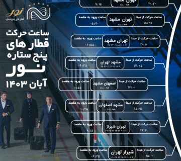 ساعت جدید حرکت قطارهای پنج ستاره نورروابط عمومی شرکت حمل و نقل ریلی نورالرضامهر ۲۹, ۱۴۰۳ساعت حرکت قطارهای پنج ستاره نور در آبان ماه ۱۴۰۳ اعلام شد. به گزارش روابط عمومی شرکت حمل و نقل ... ادامه مطلب